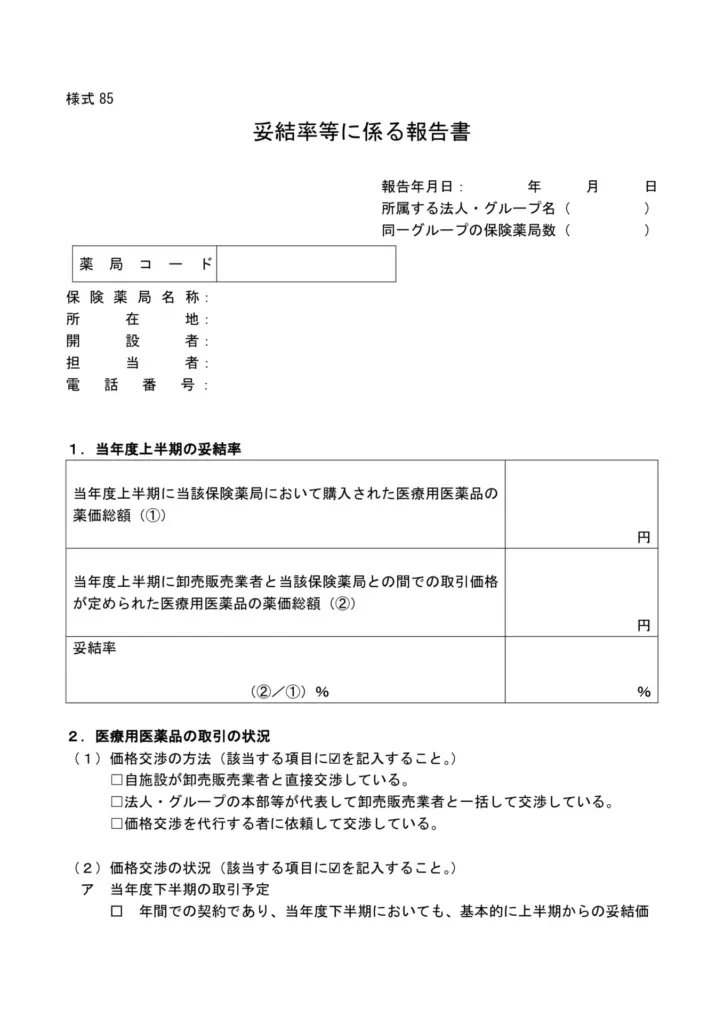 報告書は**「様式85」**を基本としますが、薬局の規模により添付資料が異なります。