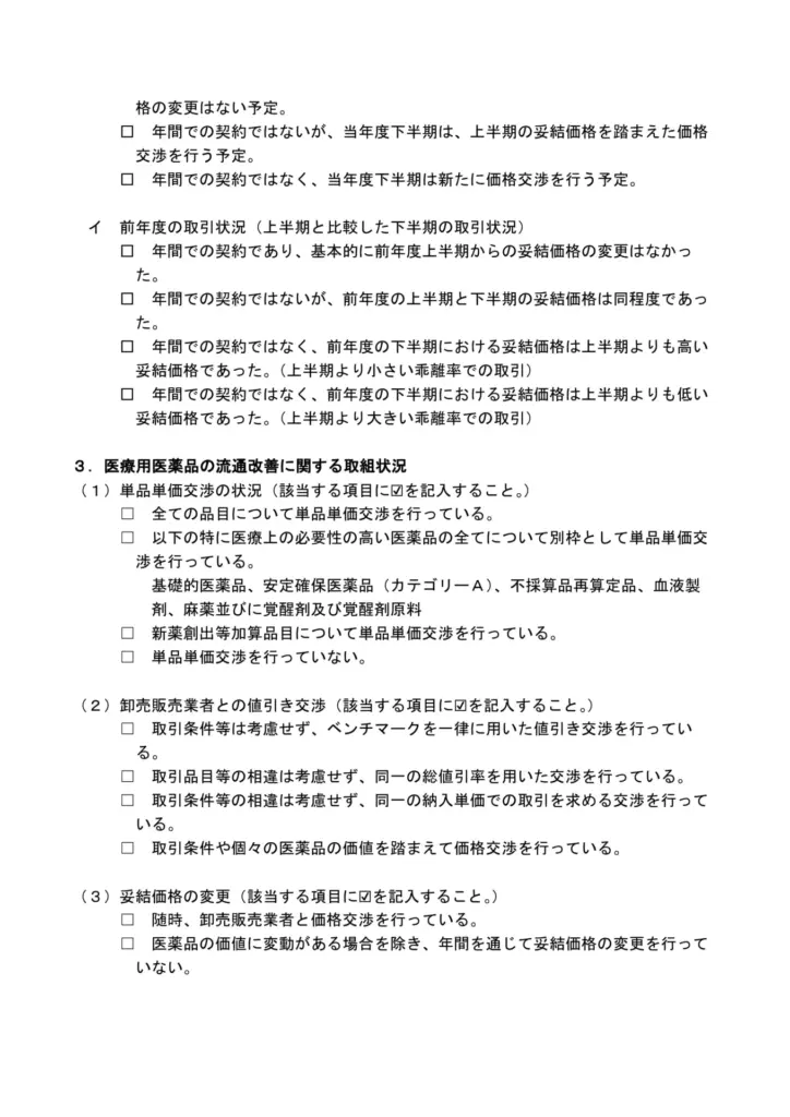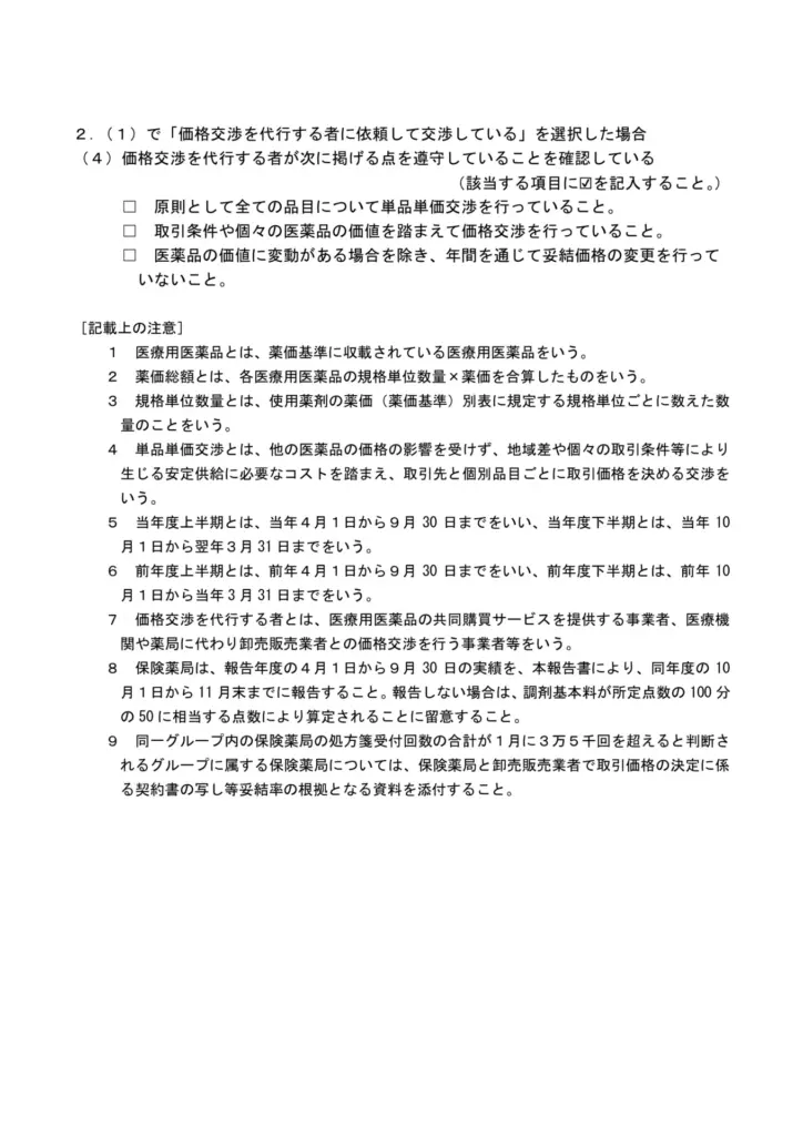 令和6年度診療報酬改定により、保険薬局と許可病床数200床以上の病院を対象に、「医薬品取引価格の妥結率、単品単価契約率、一律値引き契約に係る状況」の報告が義務化されました。